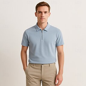 男性用 ワッフルポロシャツ クォータージップポロ 日常 祝日 クォータージップ 半袖 ファッション ベーシック 平織り 春夏 レギュラー ブラック ホワイト ブルー カーキ色 グレー ワッフルポロシャツ