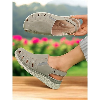 カジュアルで普段使いに最適な、カットアウトデザインとベルクロストラップを備えたグレーのレディースコンフォートサンダル