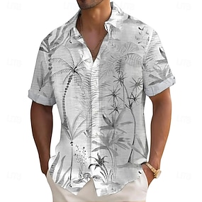 男性用 ココナッツの木 熱帯植物 カジュアルシャツ アロハシャツ ボタンアップシャツ 半袖 ハワイアン バケーション 祝日 ビーチウェア 夏 春 折襟 3Dプリント リネンライクシャツ パープル グリーン カーキ色 グレー