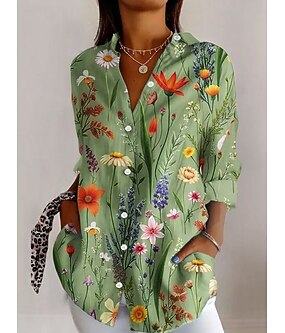 女性用シャツ ボタンダウン チュニック シャツ カラー 長袖 フローラル カジュアル レギュラー トップス ワーク デイリー s プリント グリーン 春 秋 冬