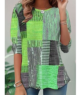 ウィメンズ T シャツ 長袖 クルーネック 長袖 チュニック グラフィック ジオメトリック プラッド カジュアル ラウンドネック レギュラー トップス デイリー プリント ピンク パープル グリーン 春 秋 プレフォール