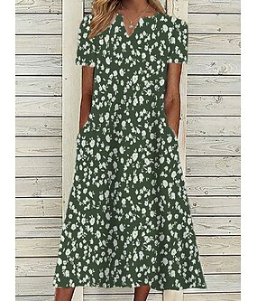 女性用 ミディドレス シフトドレス サマードレス プリントドレス 活発的 ファッション ストリートファッション アウトドア バケーション デート レギュラー フラワー 半袖 Vネック ブルー グリーン グレー 夏 春