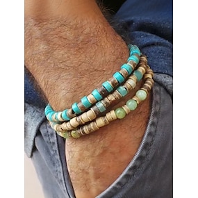 男性用ハンドメイド天然石ビーズブレスレットセット - ボヘミアンサーファースタイルの木製&ターコイズラップブレスレット、ビーチ、旅行、カジュアルウェアに最適な調節可能なトライバルジュエリー