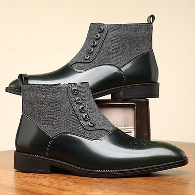 メンズのヘリンボーン生地と合成皮革のボタンアップアンクルブーツ - ビジネスやカジュアルなシーンにぴったりのヴィンテージ風フォーマルドレスシューズ