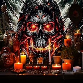 ハロウィン ドクロホラーワールタペストリー – ろうそくを持った炎のような赤い目の骸骨、ゴシックダークファンタジーシーン、2025年のハロウィンのリビングルーム、寝室、パーティー装飾用の不気味なバックドロップ