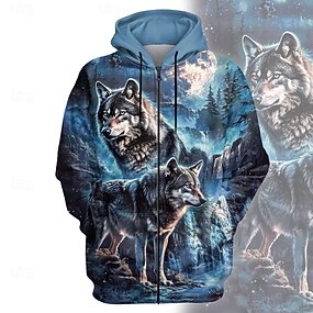 男性用 オオカミ パーカー フーディーズ スウェットシャツ ファッション 日常 長袖 フード付き 祝日 トラベル ブルー ドローストリング ジッパー ポケット 秋 冬 デザイナー
