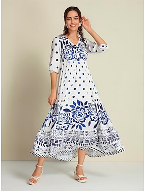女性用 スイングドレス プリントドレス リゾートウェア マキシドレス ブルー 七分袖 波点 花 花・植物 Vネック プリント ソフト 春夏 Vネック 旅行度假风 レディース ホリデー XS S M