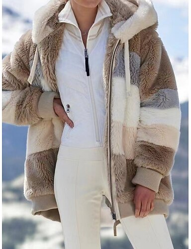 女性用 フリースの上着 テディコート クローク / 岬 保温 高通気性 パッチワーク フェイクファートリム フリースライナー カジュアル カラーブロック バケーション ストリート デイリーウェア お出かけ オープンフロント レギュラー ノーカラー レギュラー 長袖 アウターウェア ネイビーブルー カーキ色 アプリコット 秋 冬