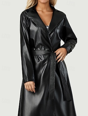 女性用 トレンチコート 保温 快適 ポケット 活発的 ファッション 平織り お出かけ 週末 オープンフロント ロング 折襟 レギュラー 長袖 アウターウェア ブラック 秋 冬