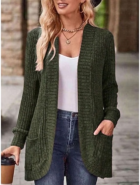 女性用 ニット カーディガン エレガント ファッション ストリートファッション ピュアカラー オープンフロント ポケット ニット 長袖 レギュラートップス ニット アウトドア 日常 週末 ピンク カーキ色 秋 冬