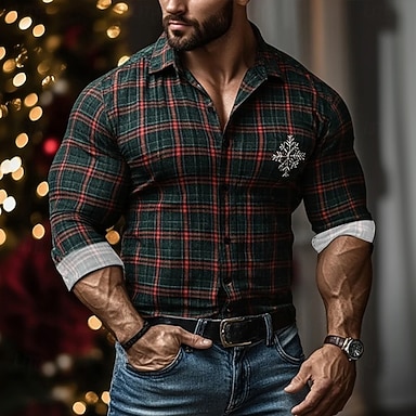 男性用 幾何学模様 グリッド / タータンチェック スノーフレーク柄 シャツ ボタンアップシャツ カジュアルドレスシャツ 長袖 ヴィンテージレトロ アウトドア カジュアル 祝日 春 秋 折襟 3Dプリント リネンライクシャツ ダークグリーン グリーン