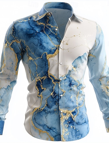 男性用 マーブル 抽象的な液体アート シャツ ボタンアップシャツ 長袖 ファッションカジュアル アウトドア 日常着 春 秋 折襟 3Dプリント リネンライクシャツ ブルー パープル