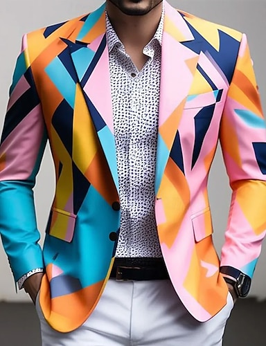 男性用 ブレザー コート カジュアル カジュアル 普段着 近代の 秋冬 ポリエステル100% カラーブロック 抽象的 3Dプリント ボタン 保温 快適 シングルブレスト ブレザー ピンク