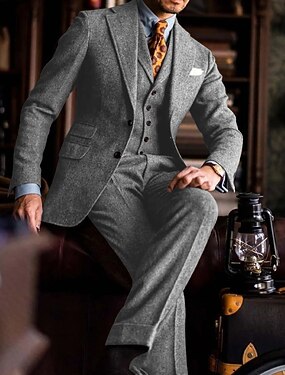 男性用 結婚式 ウェディングパーティー ツイードスーツ ノッチドラペル 褐色 ライト レトリ/ヴィンテージ フォーマル ヘリンボーン スタンダードフィット 3点セット シングルブレスト 二つボタン