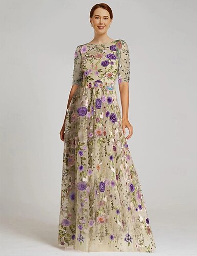 フローラル刺繍 Aライン母親のドレス フォーマル エレガント ヴィンテージ イリュージョンネック フロアレングス チュール ハーフスリーブ アップリケフラワー付き