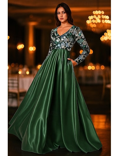 Aラインイブニングガウン エレガントなドレス フォーマル フロアレングス ロングスリーブ シャツカラー ポケット ストレッチサテン ショルダーフラワー付き