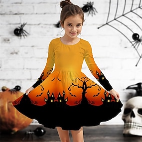 ハロウィーン 女子 3D グラフィック ドレス 長袖 夏 春 バケーション 日常 祝日 プリンセス 美しい 甘い 子供 4〜12年 カジュアルドレス A ラインドレス 膝丈 レギュラー