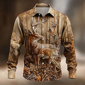 男性用 鳥 トナカイ 森林 シャツ ボタンアップシャツ 長袖 ヴィンテージレトロ アウトドア キャンピング&ハイキング ハンティング 春 秋 折襟 3Dプリント 襟付きシャツ ブラウン
