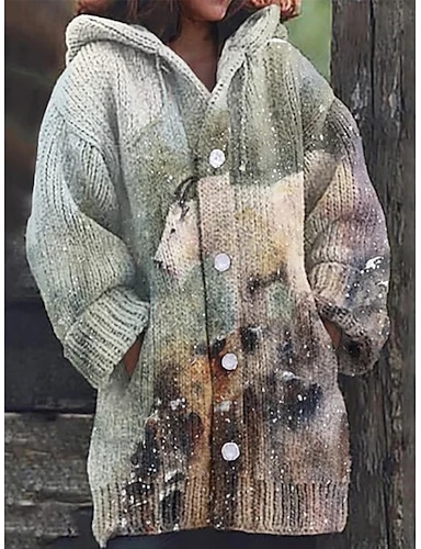 女性用 カーディガン ヴィンテージ 日常 ビンテージ 幾何学模様 リブ フード付き ニット プリント フロントポケット 長袖 レギュラートップス ニット アウトドア 日常 グリーン 秋 冬