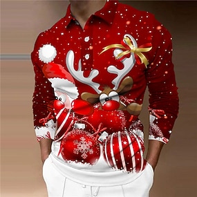 クリスマス 男性用 きらきら ポロシャツ ゴルフポロシャツ 長袖 ポロシャツ カラー カジュアル パーティーイブニングウェア 日常着 バケーション 大晦日 ボタン 3Dプリント ルビーレッド