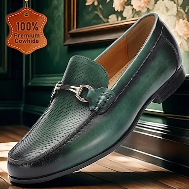 メンズ グリーン プレミアム牛革ローファー - フォーマルやビジネスウェアに最適なメタルバックルディテールのスリッポンドレスシューズ