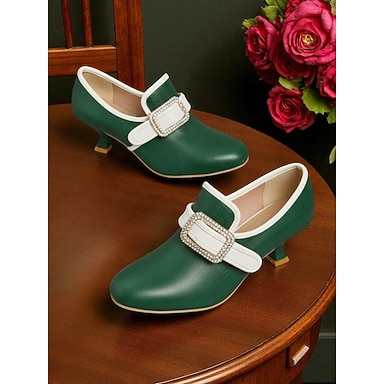 ラインストーンバックル付き1920年代のグリーンのレディースヴィンテージローヒールパンプス - ギャツビーパーティー、コスプレ、フォーマルな機会に最適なレトロなエドワード朝スタイルのドレスシューズ