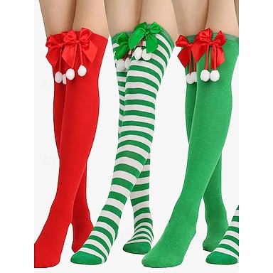 リボンとポンポンの装飾が施されたクリスマスニーハイソックス - 女性と女の子向けのお祝いのストライプと無地の色