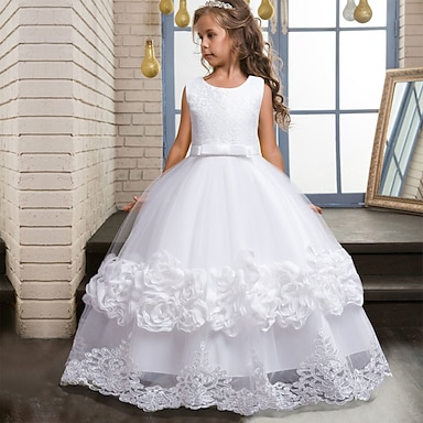 フラワーガールドレス キッズ 女の子 プリンセスドレス 性能 結婚式 パーティー エレガント 美しい メッシュ 純色 ノースリーブ クルーネック ホワイト 4年以上