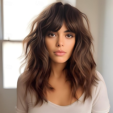 女性用ウェーブカーリーボブウィッグ、女性用チャーミングチョコレートブラウンウィッグ、肩までのミディアムレングスウィッグ、前髪付き、毎日のコスプレパーティーに