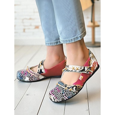 カラフルな芸術的なプリントとダブルストラップが特徴のレディース本革メリージェーンフラットシューズ。仕事、旅行、カジュアルウェアに最適な快適な普段使いのシューズです。