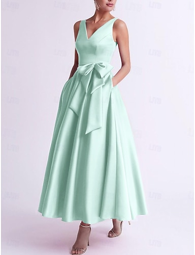 Aライン セミロング丈 カクテルドレス パーティードレス エレガント ハイ・ロー ノースリーブ Vネック 結婚式のゲスト ケンタッキーダービー ポケット サテン とともに リボン