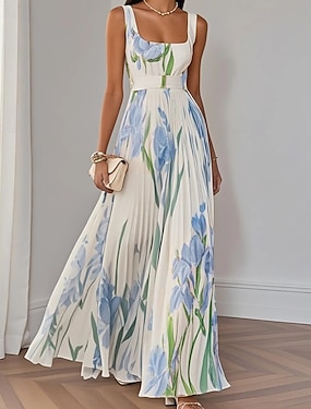 女性用 ロングドレス マキシドレス プロムドレス パーティードレス プリントドレス ファッション 近代の パーティー 誕生日 デート レギュラー フラワー ノースリーブ スクエアネック ホワイト イエロー ピンク ブルー 夏
