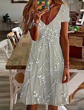 女性用 ミニドレス カジュアルドレス サマードレス ファッション 近代の 日常 ビーチ 週末 レギュラー フラワー 半袖 Vネック カーキ色 グレー 春 秋