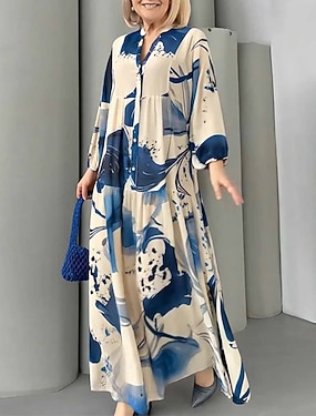ウィメンズ マキシドレス カフタン 3/4丈袖 クルーネック カジュアルドレス Aラインドレス ボヘミアン レギュラーフィット グラフィック ジオメトリック アブストラクト ピンク ブルー パープル グリーン 春 秋