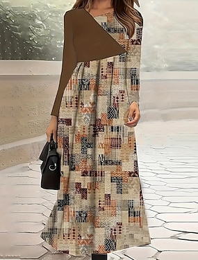 女性用 ロングドレス マキシドレス カジュアルドレス プリントドレス ファッション 近代の 日常 デート 週末 レギュラー 幾何学模様 長袖 Vネック ブラウン 春 秋