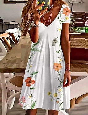 女性用 ミニドレス カジュアルドレス サマードレス ファッション 近代の 日常 ビーチ 週末 レギュラー フラワー 半袖 Vネック ホワイト 春 秋