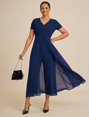 レディースジャンプスーツ ブルー Vネック パネルデザイン フェイクツーピース 流れるような透け感 ストレッチ素材 カジュアル 春 夏 秋