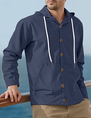 男性用 シャツ サマーシャツ カジュアルシャツ ビーチシャツ ボタンアップシャツ ブラック ホワイト イエロー ネイビーブルー カーキ色 長袖 平織り フード付き バケーション ハワイアン ドローストリング 衣類 ファッション カジュアル 快適