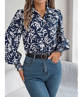 女性用 シャツ ブラウス フラワー スタイリッシュ カジュアル 長袖 ノッチネック レギュラートップス 日常 プリント ネイビーブルー 夏 春 秋