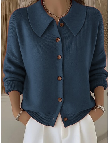 女性用 ニット カーディガン ストリートファッション カジュアル 純色 シャツカラー ボタン ニット 長袖 レギュラートップス ニット 日常 祝日 お出かけ ルビーレッド ネイビーブルー 秋 冬