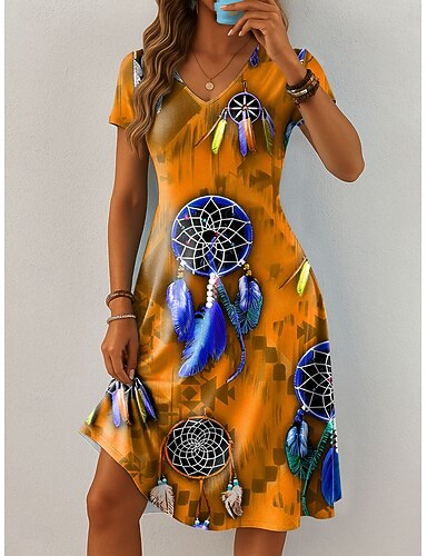 女性用 ミニドレス カジュアルドレス T シャツドレス サンドレス A ラインドレス 旅行度假风 カジュアル ボヘミアン ビーチ レギュラー グラフィック フェザー 半袖 Vネック ブルー パープル オレンジ グリーン 夏 春