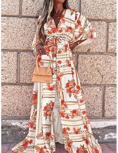 女性用 マキシドレス カジュアルドレス 自由奔放に生きるドレス かわいいスタイル スタイリッシュ カジュアル バケーション 日常 ルーズフィット グラフィック 七分袖 Vネック ルビーレッド ブルー オレンジ 夏 春 秋