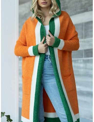 女性用 ニット カーディガン エレガント ファッション ストリートファッション レタード フード付き ポケット ニット 長袖 ロングトップス ニット アウトドア 日常 週末 ブラック オレンジ 春 秋
