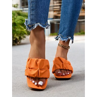 フリルのフェイクレザーストラップが付いたレディーススクエアトゥスリッポンサンダル。夏の服装や普段使いにぴったりのミニマリストカジュアルスタイル。