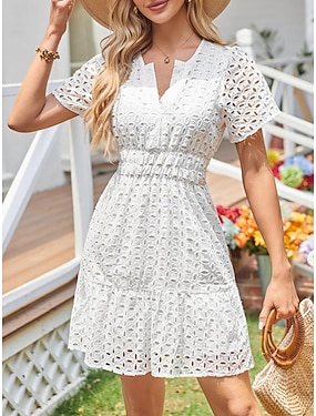 女性用 白いドレス ミニドレス レース アイレット バケーション カジュアル スプリットネック 半袖 ブラック ホワイト イエロー カラー