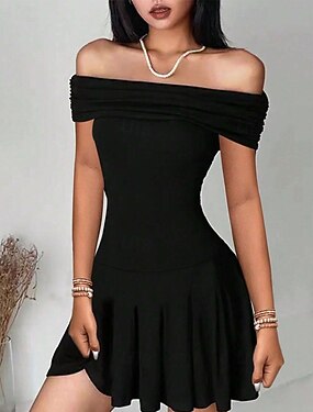 女性用 ミニドレス 黒いドレス プロムドレス カジュアルドレス 二次会ドレス / カクテルドレス ファッション アウトドア パーティー 祝日 レギュラー 平織り ノースリーブ オフショルダー ブラック 夏 春