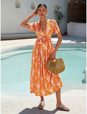 女性用 ミディドレス マキシドレス オレンジ 半袖 幾何学模様 ベルト付き 春夏 Vネック 柄ドレス S M L