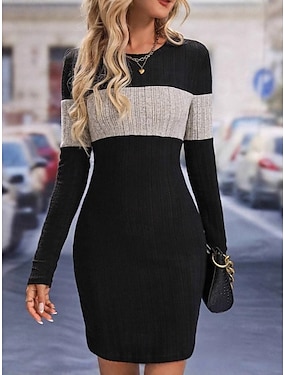 女性用 ニットワンピース ミニドレス パッチワーク リブ カジュアル フォーマル クルーネック 長袖 ブラック カラー