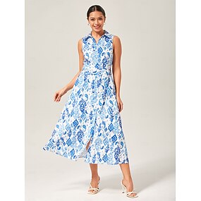 女性用 女性 カジュアルドレス ミディドレス ブルー ノースリーブ 抽象的 抽象芸術 プリント 夏 シャツカラー エレガント 旅行度假风 XS S M