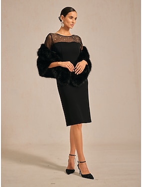 女性用 ひざ丈ドレス 黒いドレス セミフォーマルドレス バケーション 七分袖 クルーネック ブラック